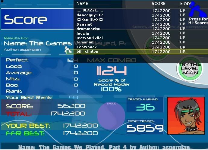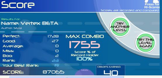 I got to 1305 combo, about 50 steps after the trills and died, but I'm done whoring it for now, it makes my hands pretty tired after only 3 or 4 runs. *** EDIT OMFG EPIC AAA!!!! ![]() Oh wait.... lol Last edited by darkshark; 04-26-2007 at 12:12 PM.. |