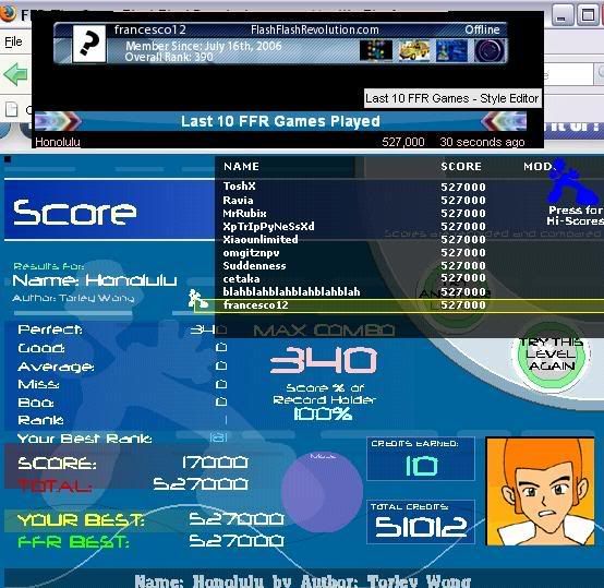 Spread Tier Points: 361 (336 + 25 for 222 AAAs) = Tier 4 BooFlags: 3, Blackflags: 12 AAA's: 191 non-token Most Recent: Euthanasia, Samurai Road, Fantasia, Lost Best: State of Emergency, Evil Approaches College Sophomore ![]() Link to Token 28 - Rocking Ass http://flashflashrevolution.com/toke...urkey.php |