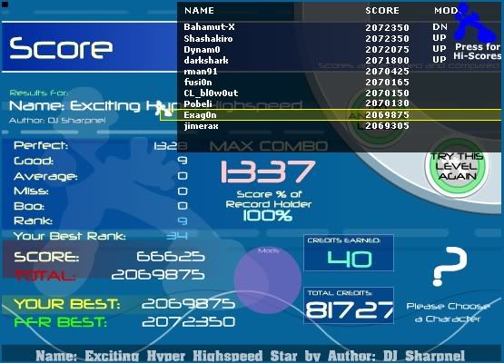 ![]() Song suddenly became pretty easy. You can do it too smartdude. ![]() 1st and last try. ![]() And oh my GODnick, that's the longest post I've seen in this thread. |