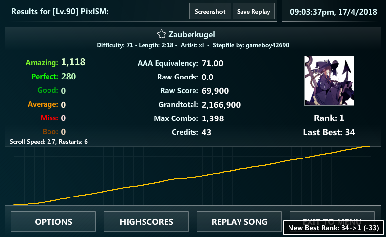 ![]() Great first score! considering I haven't played ffr in a month gotta work on my acc to get strong MA! ᕦ╏ ʘ̆ ‸ ʘ̆ ╏ᕤ