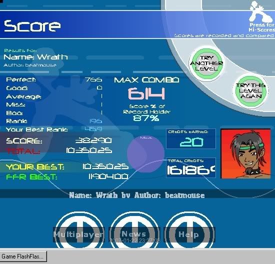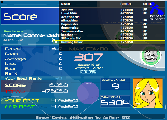 ![]() here's the fc. ![]() Now some good scores ![]() ![]() And my favorite song on stepmania. (Besides Solitude Sun) AAA#112 ![]() |
