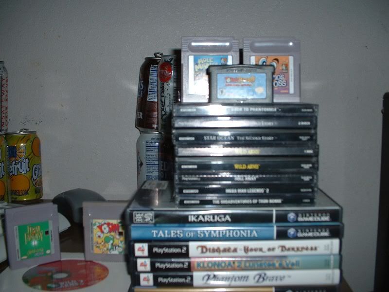 No idea why I did this. I was bored. Oh and there are random PS2 games (Klonoa 2, XS2, and BoF5) on top because they were on my desk and I didn't look there at first.