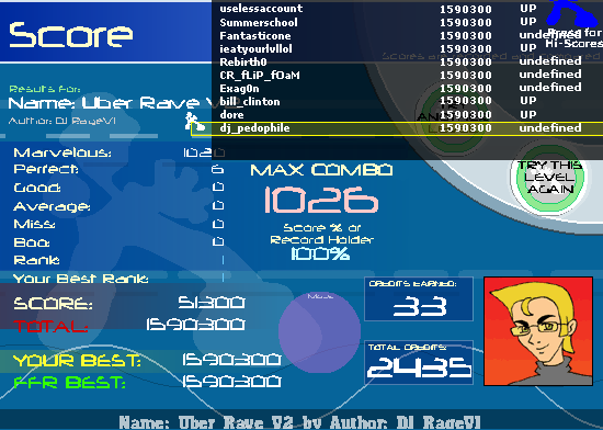 I think you all know FFR runs at 30 FPS. There are three frames where you can get a perfect. That's an odd number, which means we can add marvs and set it to where you have to hit that middle frame. That means a marv right now is hitting the note no more than 1/30 of a second earlier or later than the arrows are layed out. I don't know what Stepmanias is though.. It seems harder to hit a marv on FFR, which is why I didn't AAAA Uber Rave A few of us thought.. with the addition of marvs (that won't affect or change our scores at all), people will try to hit all marvelous' which will make us get more perfects, which will make us have better PA and let us AAA stuff easier. Best score you can get is still a AAA. MA is just for show Last edited by Rebirth0; 08-5-2007 at 10:33 AM.. |